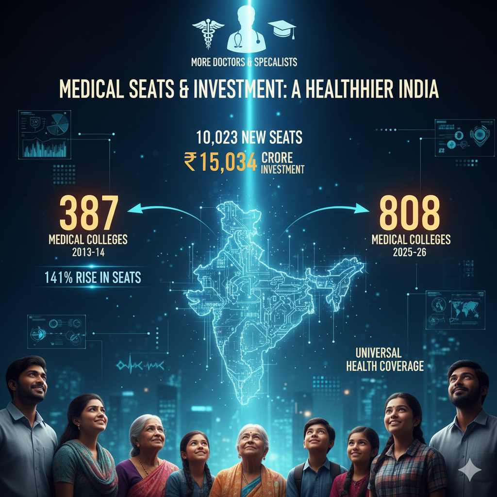 The government approved 10,023 new medical seats with an investment of ₹15,034 crore to achieve the goal of 75,000 additional medical seats and improve universal health coverage. India had 387 medical colleges in 2013-14, which increased to 808 in 2025-26. This growth led to a 141 per cent rise in undergraduate and postgraduate seats. The new regulation permits experienced government specialists to become professors without the mandatory residency requirement.